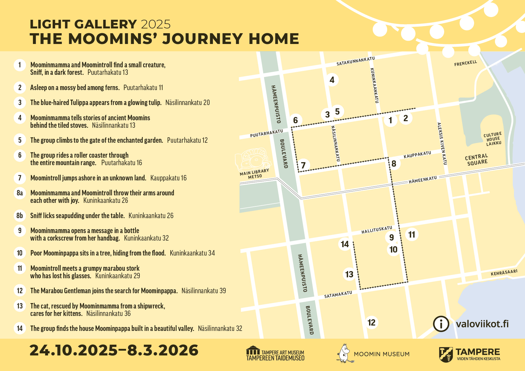 In honor of the Moomin 80th anniversary, Tampere Art Museum’s collection artist Tove Jansson has been chosen as the Light Gallery artist of 2025. The light art installation, projected onto the facades of central Tampere buildings, is titled The Moomins’ Journey Home. The illustrations have been selected from Jansson’s very first Moomin story. Light Gallery is part of the Tampere Festival of Light, opening in October.